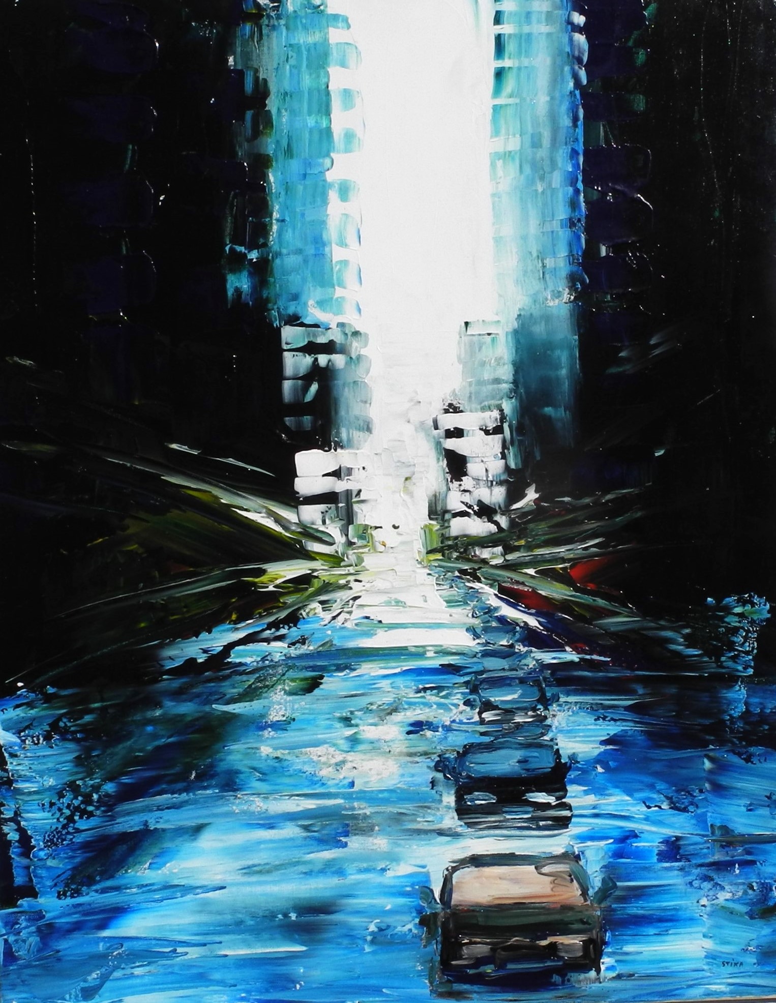 Grelle Neon-Werbetafeln, lärmender Straßenverkehr, ... es entsteht ein künstlicher Lebensraum, der geprägt ist von der Dynamik des kommerziellen Treibens einer ruhelosen Metropole. Diametrale Lichteffekte erzeugen dabei bewegte Kontraste, die durch den gestischen Pinselduktus des Malers in der Wirkung noch dramatisch verstärkt werden.