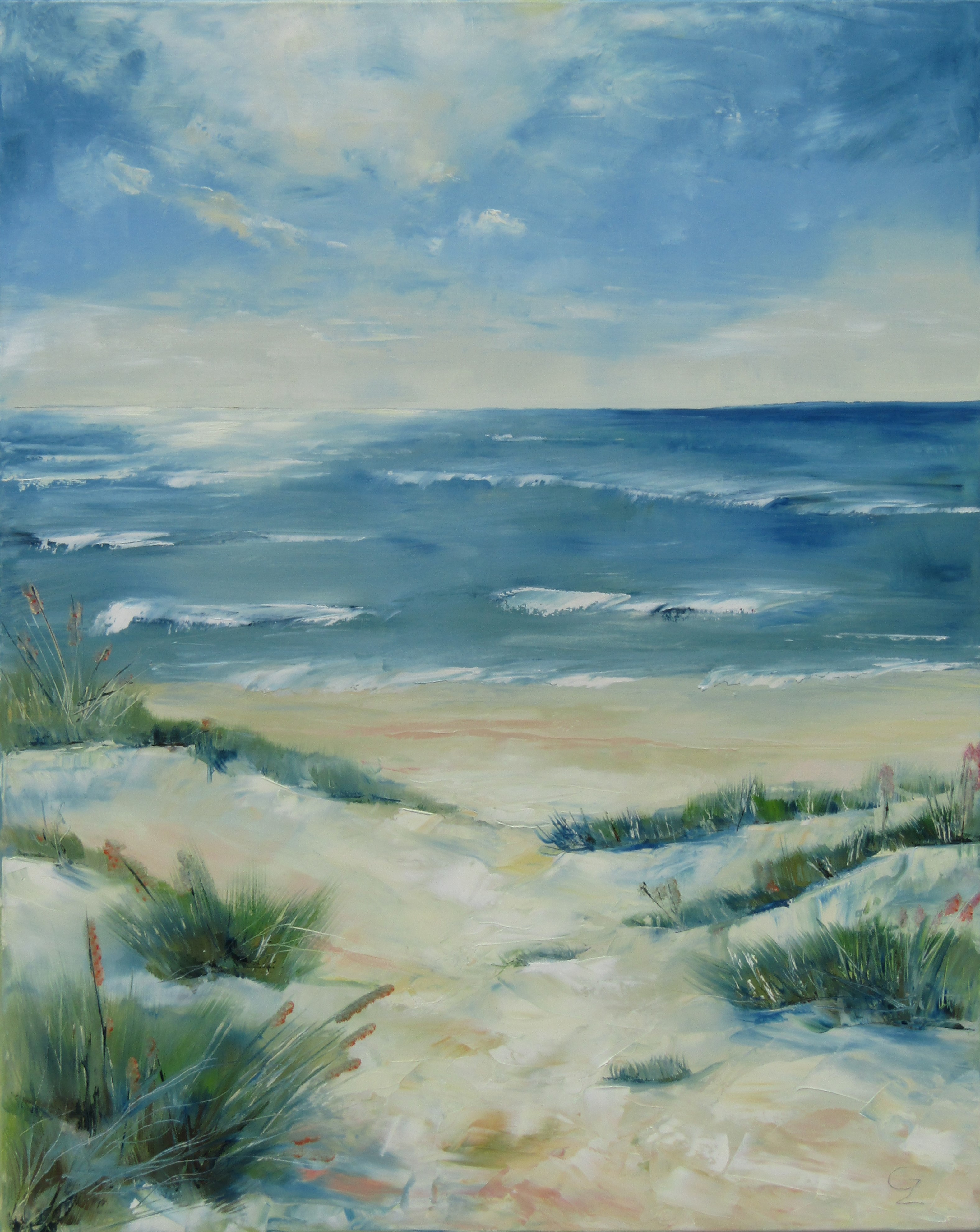 Die Serie "Zwischen den Meeren" von Künstlerin Christa Zenzes entführt Ihren Betrachter an Deutschlands schönste Strände: Egal ob Hiddensee, Ahornshoop, Usedom oder Fischland mit lebendiger Farbigkeit fängt Christa Zenzes die Naturschönheit und den ganz besonderen Charme jedes einzelnen Ortes ein. Die Ausstellung in Öl-Technik lässt Horizont und Meeresblau sanft miteinander verschmelzen. Die Weite des Himmels und des Meeres stimmen den Betrachter frei und glücklich. Alles scheint in Bewegung; die Wellen, die Gräser der Dünenlandschaften, die Blätter an den Bäumen und die Wolken am Himmel. Schnell fühlt man sich an den letzten Urlaub erinnert, wenn man beim näheren Betrachten Spaziergänger zwischen den Gezeiten entdeckt, Strandkörbe erblickt und Möwen in trauter Zweisamkeit am Strand sitzen sieht. Ein einsames Holz Boot am Strand und die hübschen Schilfdächer machen die Idylle perfekt - Diese Ausstellung ist Balsam für die Seele.